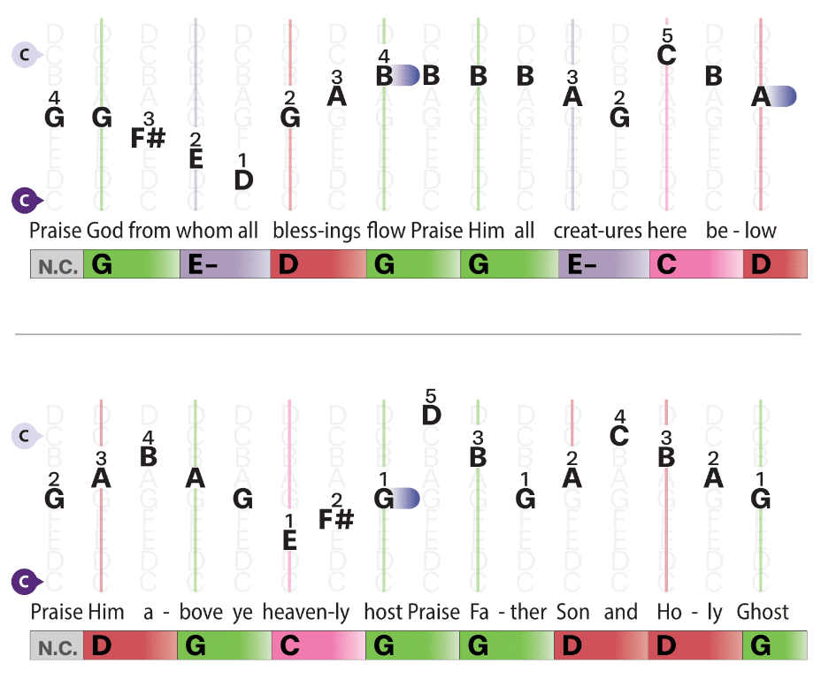 Doxology is in the key of G major, which means you’ll be playing all white keys, except F will be raised to F♯.